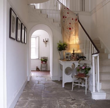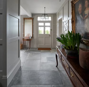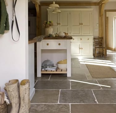 The term 'flagstone' describes a type of floor — large, flat stones laid together to form a surface — rather than one specific stone. In Sussex properties we commonly encounter: