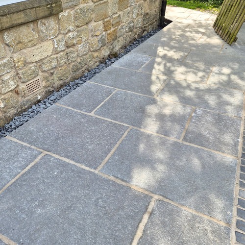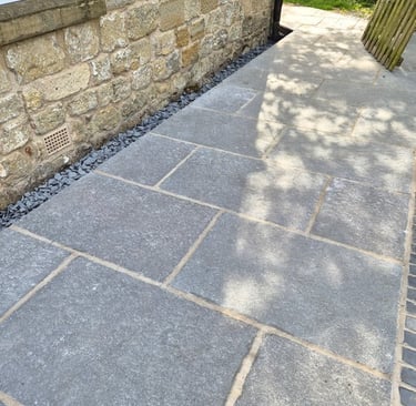 We identify the specific stone — sandstone, York stone, slate, limestone or other — and assess its thickness, condition and any structural issues. This dictates every decision that follows.