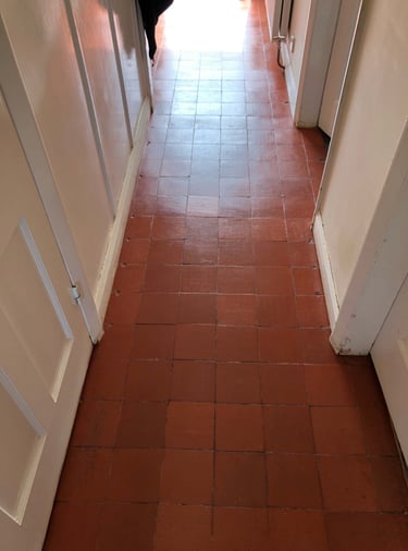 Quarry tiles need slightly different treatment to natural stone. They don't respond to diamond polishing in the same way as marble or limestone — instead, the restoration process focuses on stripping away the accumulated contamination of decades, lifting ingrained dirt from the porous surface, and applying the right type of sealer for the tile's character and use.